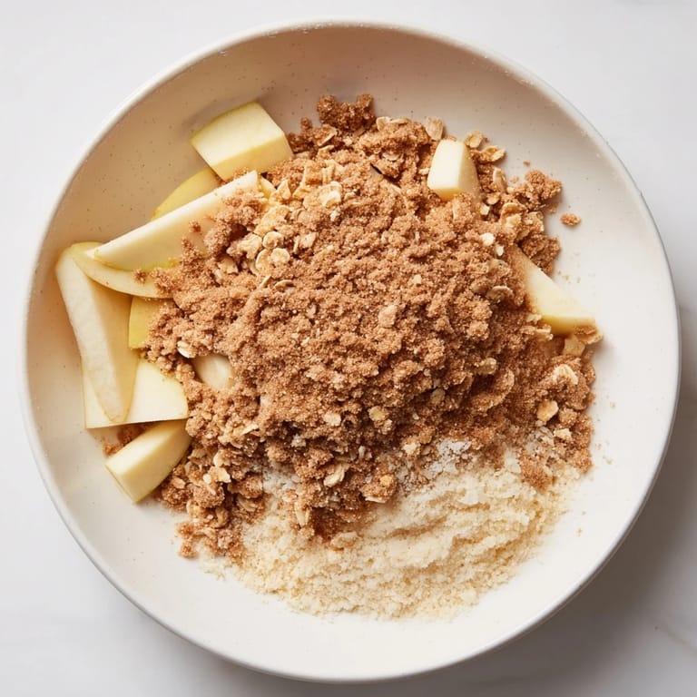 Cutting cold butter into the dry ingredients until coarse crumbs form and folding in rolled oats ensures a golden, crunchy topping.