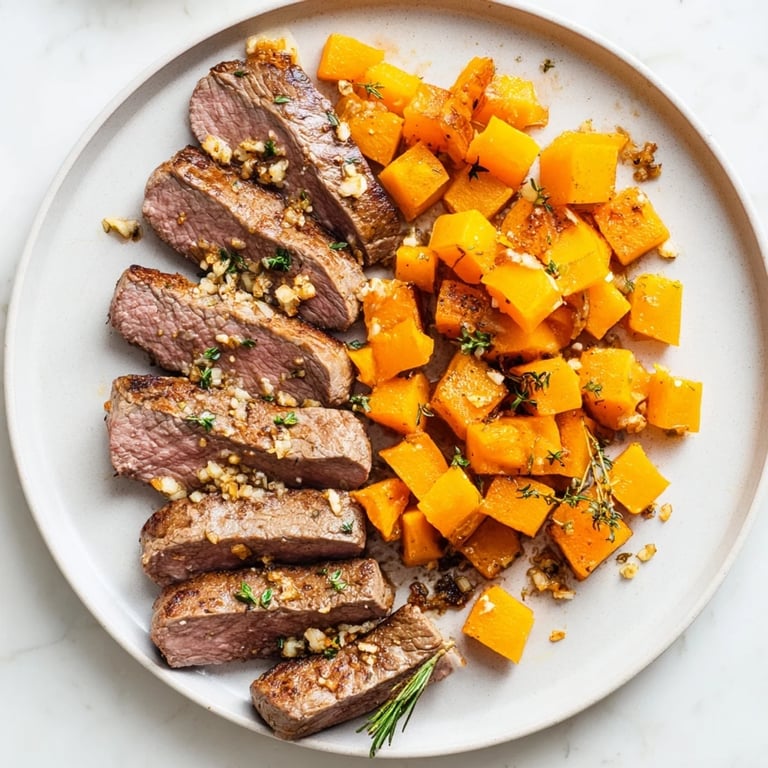 Save A vibrant and satisfying bowl combining juicy garlic-herb steak with sweet roasted butternut squash, finished with aromatic herbs for a deliciously balanced meal.