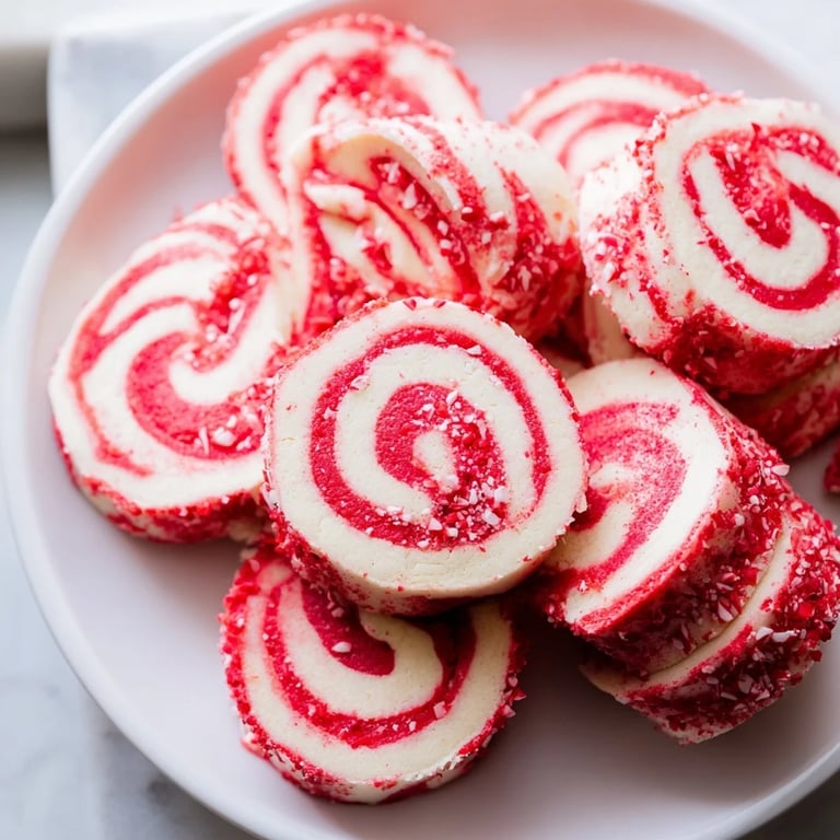 These candy cane pinwheel treats bring holiday cheer with their vibrant red and white swirls and subtle peppermint flavor. The dough is divided, tinted with red gel coloring, and carefully rolled to create beautiful spirals. Chilling ensures easy slicing and preserves shape, while a quick bake yields tender, buttery cookies with a crisp edge. Optional crushed candy canes add a festive crunch. Ideal for sharing during winter celebrations, they pair wonderfully with warm beverages.