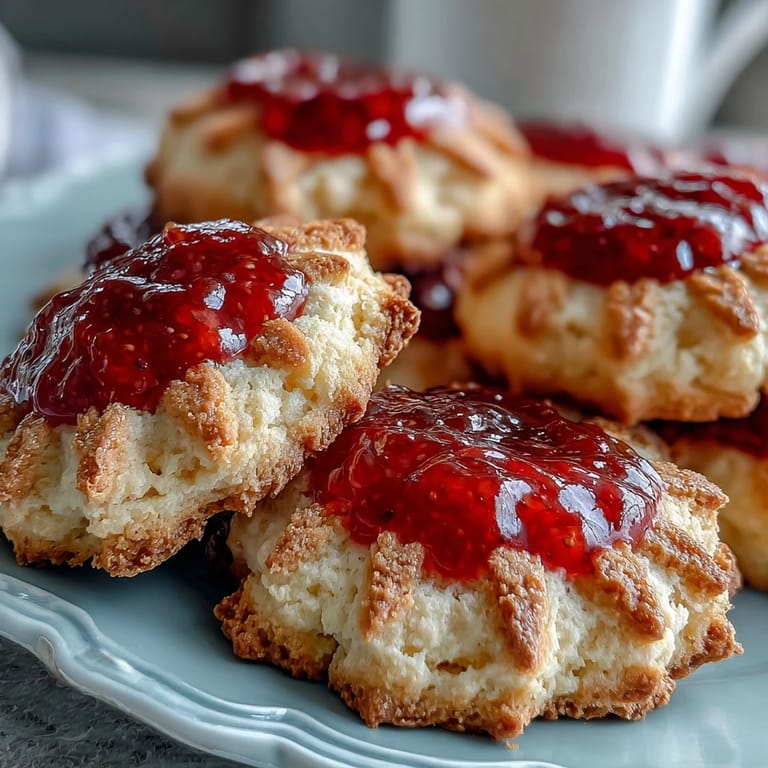 These tender sugar cookies are enriched with rich clotted cream, creating a buttery, soft texture that melts in your mouth. Each cookie is finished with a jewel-like center of sweet strawberry jam, adding a burst of fruity flavor. Perfectly golden on the edges and soft inside, they make an ideal teatime indulgence or special treat. The recipe is straightforward, combining dry ingredients with a fluffy blend of butter, clotted cream, and sugar, then carefully filled before baking to perfection. Variations with other jams or a hint of lemon zest can add delightful twists.