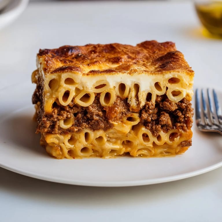Save A classic Greek casserole featuring layers of tubular pasta, savory spiced beef, and creamy béchamel sauce, baked to golden perfection.