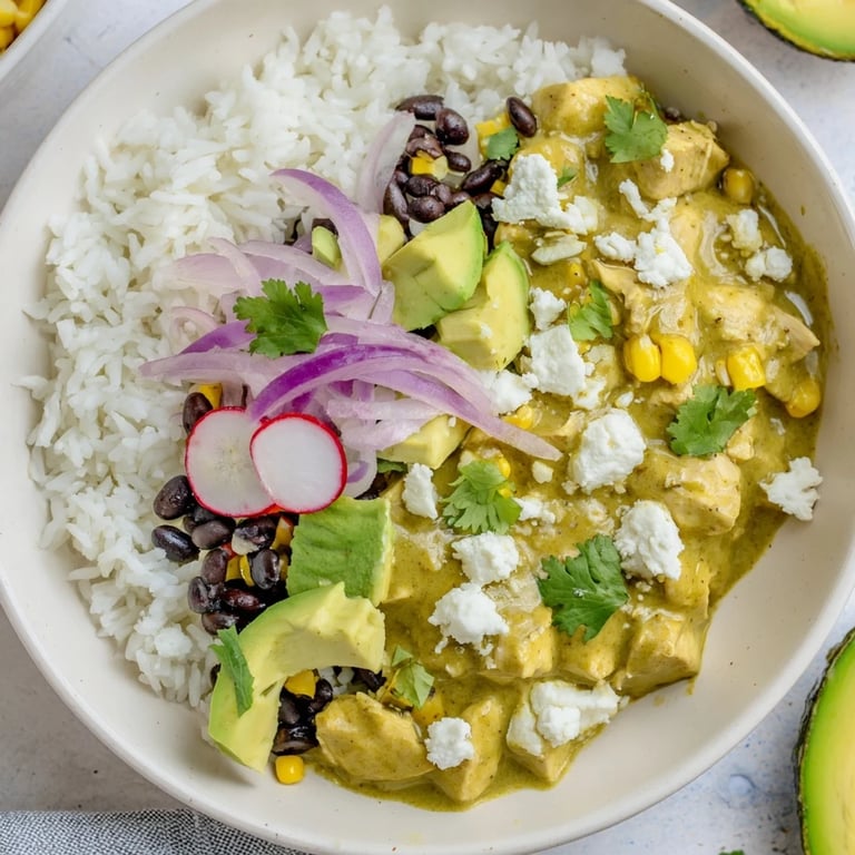 A vibrant and flavorful bowl featuring zesty green enchilada sauce, tender chicken, fluffy rice, and fresh toppings: a satisfying Tex-Mex meal perfect for busy weeknights.