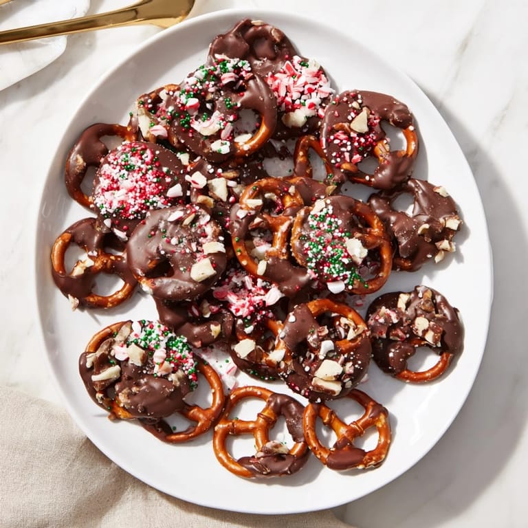 Save Crispy pretzel thins coated in rich chocolate and sprinkled with festive toppings are an irresistible sweet and salty holiday treat that's perfect for snacking or gifting.