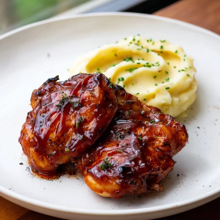 Tender chicken thighs in honey BBQ glaze served with creamy garlic mashed potatoes for a flavorful meal.