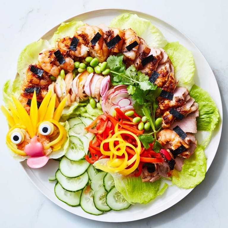 Use lettuce leaves to form the dragon’s body line, layering proteins as scales, and use sliced fruits and veggies to sculpt the head and tail features.