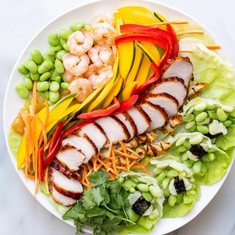For a vegetarian version replace shrimp and BBQ pork with marinated tofu or additional vegetables. Add sesame seeds or crushed peanuts for crunch. Pair with a light aromatic white wine or jasmine tea.