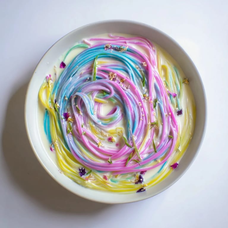 Save A vibrant, whimsical noodle dish featuring colorful noodles nestled in a soft, cloud-like creamy sauce. Perfect for parties or to delight kids and adults alike.