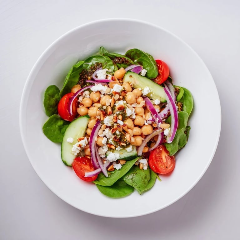 There's something about the smell of fresh basil hitting the food processor that makes me feel like I'm cooking in someone else's kitchen—in the best way. I stumbled onto this salad on a Wednesday afternoon when my fridge had exactly three things: a can of chickpeas I'd been meaning to use, a bunch of basil that was about to turn dark, and a handful of spinach. What started as mild panic became this bright, green-flecked bowl that tasted like summer decided to show up early. Now it's my go-to when I need something that feels fancy but takes less time than scrolling through my phone.